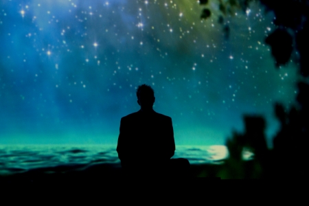 A striking image depicting the silhouette of a solitary figure looking up at the sky in a surreal, ethereal environment. The man stands alone in a mystical landscape, symbolizing introspection