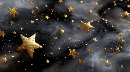This captivating image features elegant gold stars floating against a dark cosmic backdrop, enhanced by sparkling particles and ethereal swirls, perfect for creative projects.