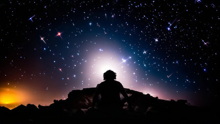 A lone figure gazes at a breathtaking celestial display. Concept Night Sky, Stargazing, Contemplation, Astronomy, Wonder