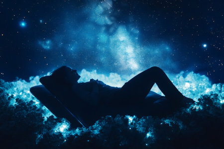 Silhouette of a woman lying on a giant smartphone, enjoying the view of a breathtaking starry night sky