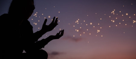 Banner of Faith christianity with christian worship concept. Spiritual prayer hands over sun shine with blurred beautiful sunset background. Woman praying to god with hopeful blessing against sunset.