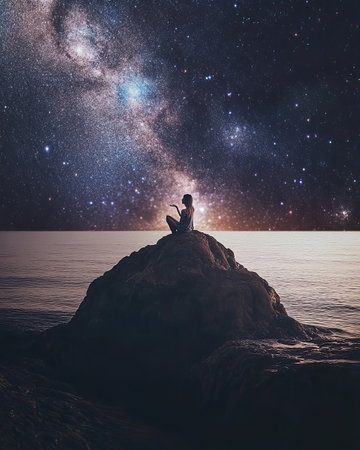 A person sits peacefully on a rock by the water, surrounded by a breathtaking night sky filled with stars and galaxies, enjoying calming space music.