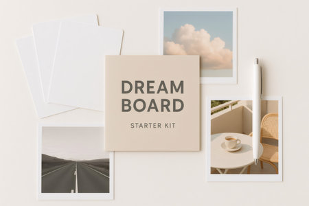 Dream board starter kit box placed with blank cards, pen, and instant prints envisioning goals and aspirations