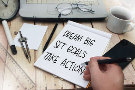 Dream Big Set Goals Take Action words letter, written on notepad, work desk top view. Motivational business typography quotes concept