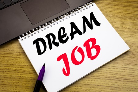 Hand writing text caption inspiration showing Dream Job. Business concept for Dreaming about Employment Job Position written on notebook book on wooden background in the Office with laptop