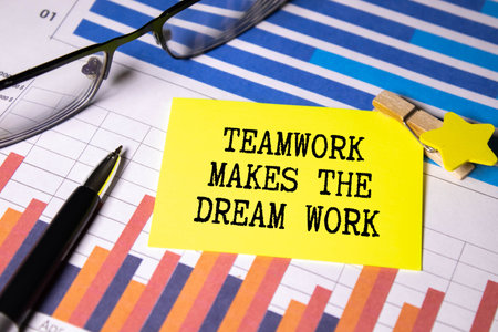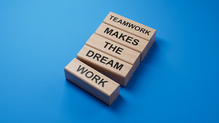 Teamwork makes the dream work symbol. Concept words Teamwork makes the dream work on wooden blocks. Business Teamwork makes dream work concept. Copy space.3D rendering on blue background.