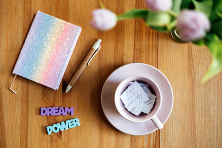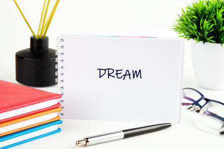 Notepad with the word Dream on white background. Wish list of desires and plans. Copybook close up.