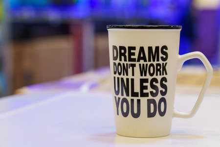 Work mug with motivational inscription dreams dont work unless you do. Illustrative editorial. February 2, 2022 Balti Moldova