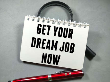Text GET YOUR DREAM JOB NOW on notebook with pen and pen on gray background.