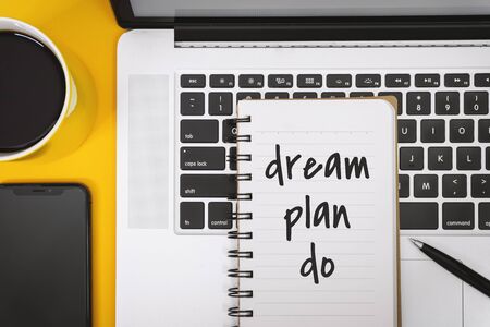 Motivational and Inspirational Quotes. Dream Plan Do. Still Life of Notebook on Work Desk.