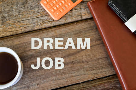 Dream Job text on notepad and office tools on wooden table