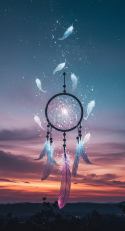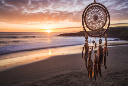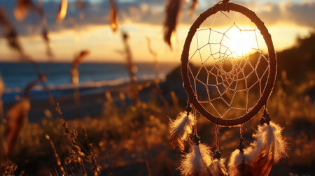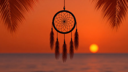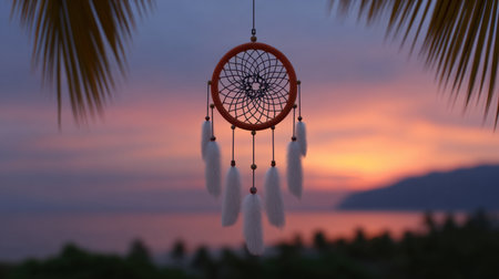 A dreamcatcher hangs over the ocean at sunset. The dreamcatcher is made of feathers and is suspended from a string. The scene is serene and peaceful, with the sun setting in the background