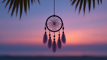 A stunning silhouette of a dreamcatcher hangs against a vibrant sunset, framed by palm leaves. This calming scene captures the essence of serenity and natural beauty, ideal for inspirational themes.