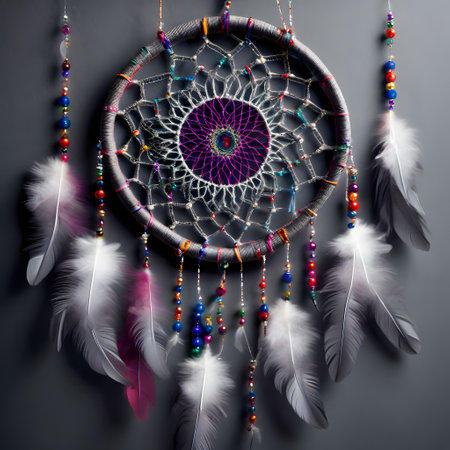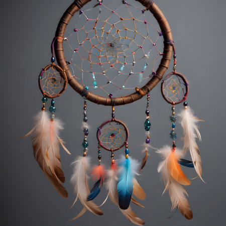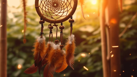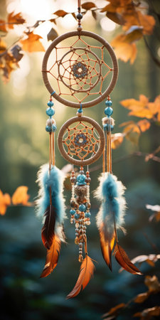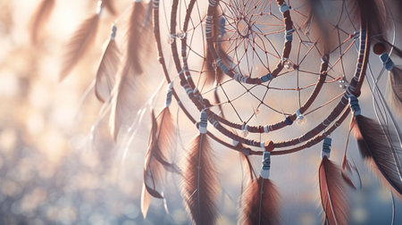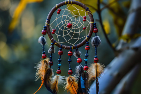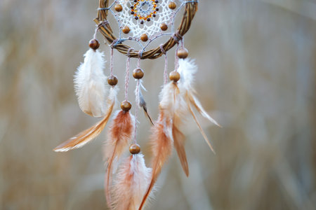 Handcrafted dreamcatcher adorned with feathers and beads dangles elegantly against a natural backdrop