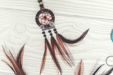 Ethnic dreamcatchers on a wooden background. Dream catchers, indian amulet, feathers, decoration.