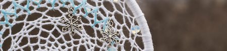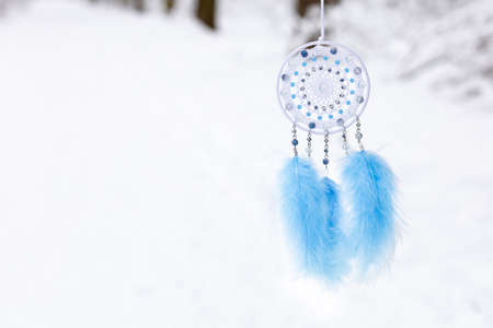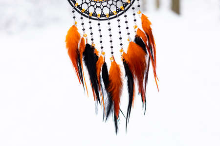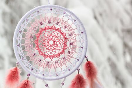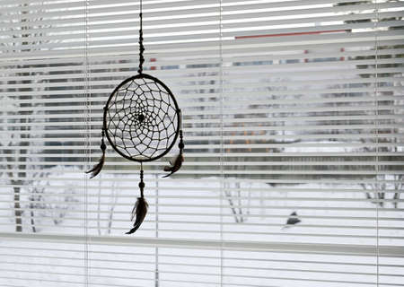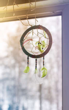 Handmade dream catcher on window background in winter day. Tribal decorative design element. Decor made of the colorful beads and feathers