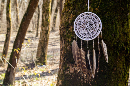 Dreamcatcher hanging on a tree. Boho chic, ethnic amulet
