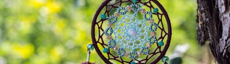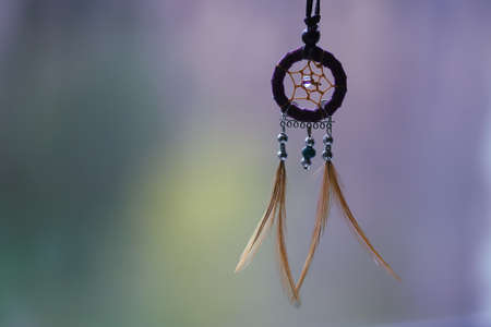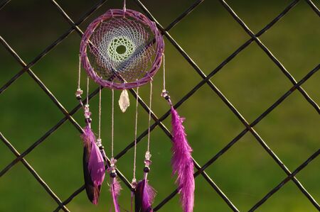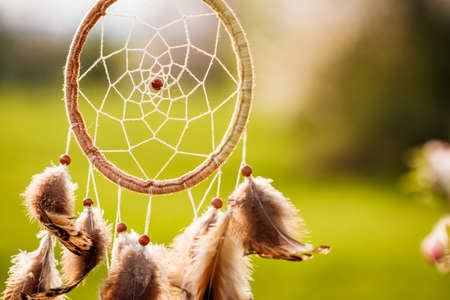 Dreamcatcher hanging in wind at springtime. Magical and ritual ornament for good dreaming. Close-up spiritual amulet