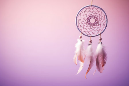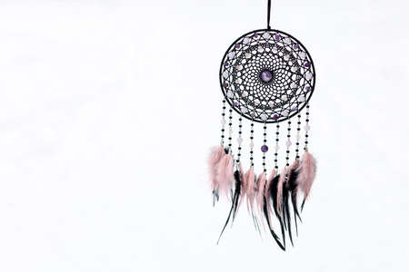 Dream catcher with feathers threads and beads rope hanging. Dreamcatcher handmade in very pei trendy color. background. Color of the year 2022.
