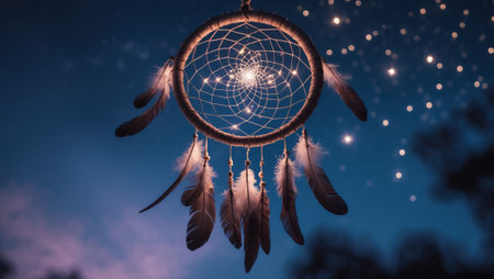 Illustration of a large, ornate dreamcatcher hanging from a tree branch in the moonlight. The delicate feathers and intricate beading catch the glow, creating a mystical and serene feeling.