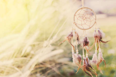 Close up of Dream Catcher on meadow background with soft vintage tone