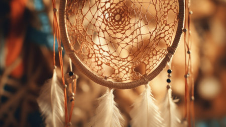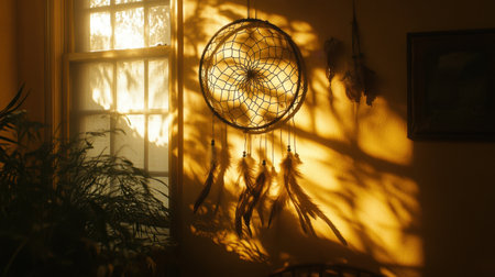 Dream catcher hung near a window, sunlight streaming through its threads, casting mystical shadows on the walls