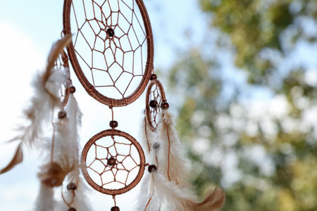 Shamanism. Beautiful dream catcher hanging outdoors, closeup. Space for text