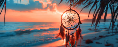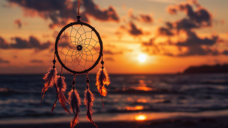 A stunning dreamcatcher hangs gracefully against a breathtaking sunset, casting a serene vibe over the calm sea. The vibrant hues of the sky illuminate the delicate feathers and intricate design, creating a perfect moment of tranquility and beauty in nature.