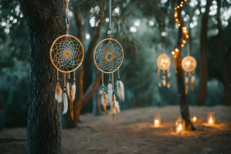 Dreamcatchers with feathers hanging from trees in a magical forest with warm lights, creating a bohemian and spiritual atmosphere