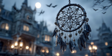 A dark dreamcatcher with skulls and feathers, set against a spooky haunted house background