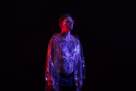 Young man with piercings, tattoos and stylish clothes posing in neon lights on black background