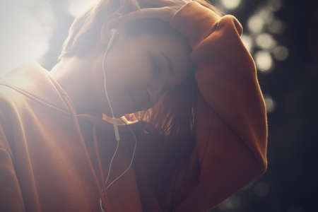 Hipster attractive girl in park using earphones. Pretty woman listening music