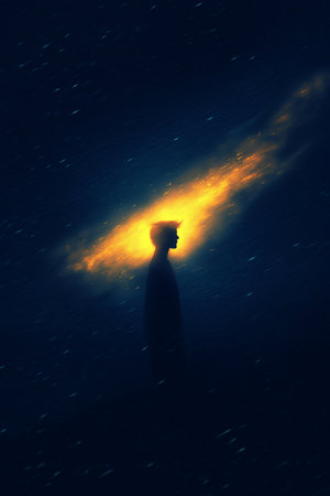 A striking image depicting the silhouette of a solitary figure looking up at the sky in a surreal, ethereal environment. The man stands alone in a mystical landscape, symbolizing introspection
