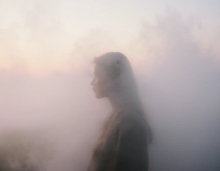In the early morning light, a girl stands shrouded in soft mist. The haze around her creates a dreamlike atmosphere, highlighting a moment of peaceful solitude.