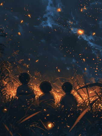 Silhouette of children sitting on a grassy hill, watching stars, night sky above, magical and whimsical atmosphere