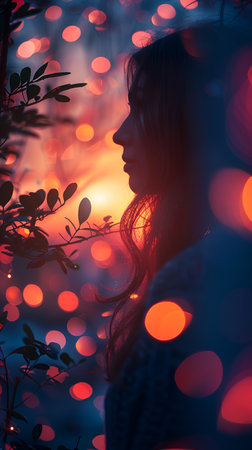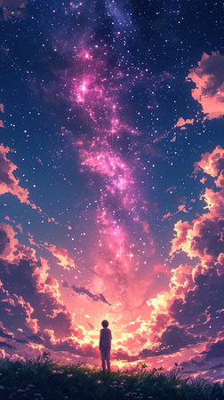 A young woman with a ponytail stands in profile, watching a colorful sunset while surrounded by twinkling stars in a peaceful landscape.