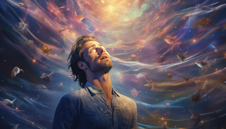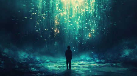 A man's profile is illuminated by soft light, creating a serene atmosphere. Water and ethereal elements swirl around, enhancing a moment of introspection and wonder in a dreamy landscape.
