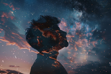 A man's silhouette is shown against a backdrop of stars and clouds. Concept of wonder and awesome at the vastness of the universe