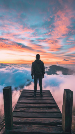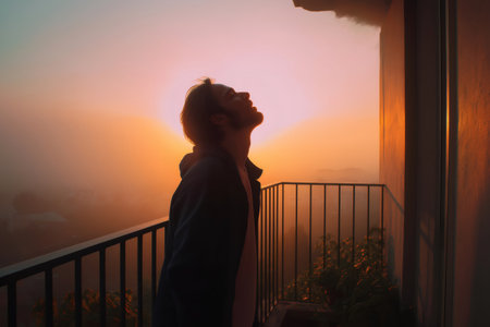 Man breathing in fresh air on a balcony, savoring the stunning sunrise illuminating a misty valley, embracing tranquility and inspiration