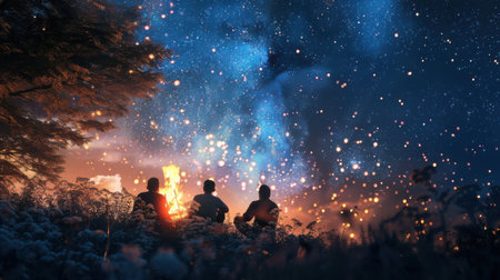Three figures sit in a circle around a campfire, illuminated by the flames, while gazing up at the vast night sky filled with countless stars. The silhouettes of the figures are crisp against the bright expanse of the starry sky, creating a serene and captivating scene.