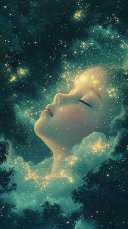 A child appears softly illuminated, their face serene and calm, nestled amidst clouds and stars. The scene evokes a sense of wonder and tranquility in a nighttime atmosphere.