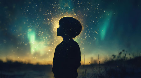 A child's silhouette stands against a tundra landscape, illuminated by vibrant auroras. The glowing light reflects in their gaze, creating a magical atmosphere at twilight.