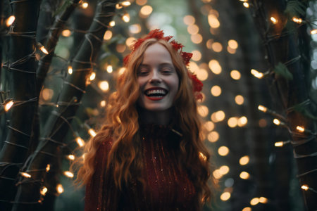 Portrait of a beautiful girl with red hair in a red dress on the background of garlands