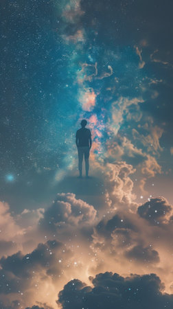 A person is standing in the sky above a cloud of clouds. The sky is filled with stars and the clouds are white and fluffy. The person appears to be looking up at the stars
