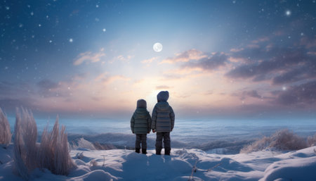 two young boys stand in the snow overlooking a white moon.