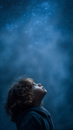 A young child with curly hair looks up in awe, captivated by a starry night sky filled with shimmering stars and cosmic beauty. The moment captures pure wonder and curiosity.