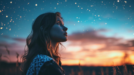 Beautiful lonely young woman gazing at the stars in the quiet evening. Copy Space