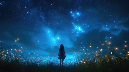 A woman's silhouette stands in a field under a starry sky with glowing flowers