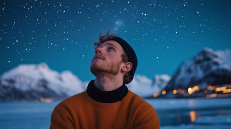 Man gazing at starry night sky in a snowy landscape, surrounded by mountains and calm waters