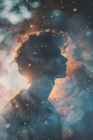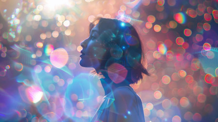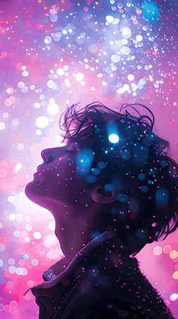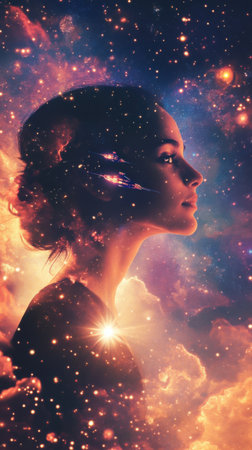 A woman stands in profile, her glowing silhouette blending with vibrant cosmic elements. Soft colors illuminate her face, creating a tranquil atmosphere filled with wonder and serenity.